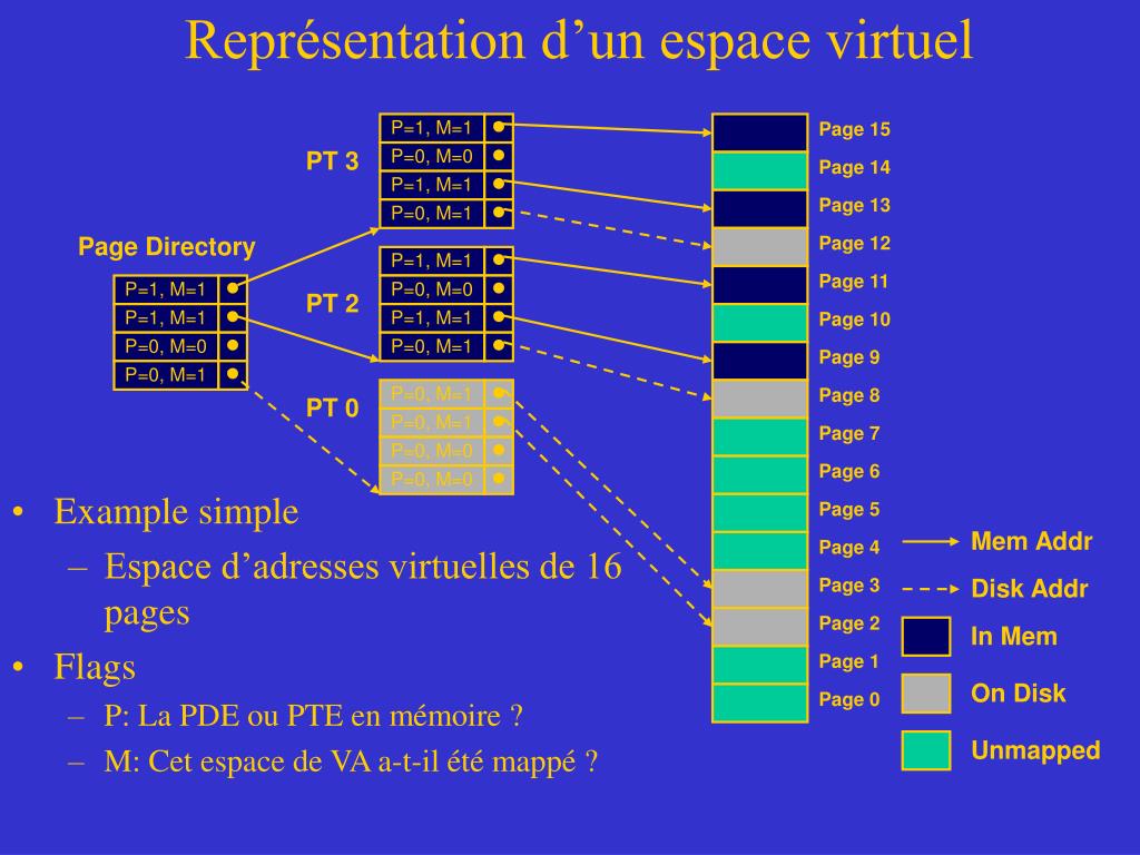 Représentation d’un espace virtuel Page 15 PT 3 Page 14 Page 13 Page Directory Page 12 Page 11 P=0, M=1 P=1, M=1 P=1, M=1 P=1, M=1 • • • • PT 2 P=0, M=0 P=0, M=1 P=0, M=0 P=1, M=1 • • • • Page 10 P=0, M=0 P=0, M=0 P=1, M=1 P=1, M=1 • • • • Page 9 P=0, M=1 P=0, M=1 P=0, M=1 P=0, M=0 • • • • Page 8 PT 0 Page 7 Page 6 Mem Addr Page 5 Disk Addr Page 4 Page 3 In Mem Page 2 On Disk Page 1 Page 0 Unmapped • Example simple • Espace d’adresses virtuelles de 16 pages • Flags • P: La PDE ou PTE en mémoire ? • M: Cet espace de VA a-t-il été mappé ?