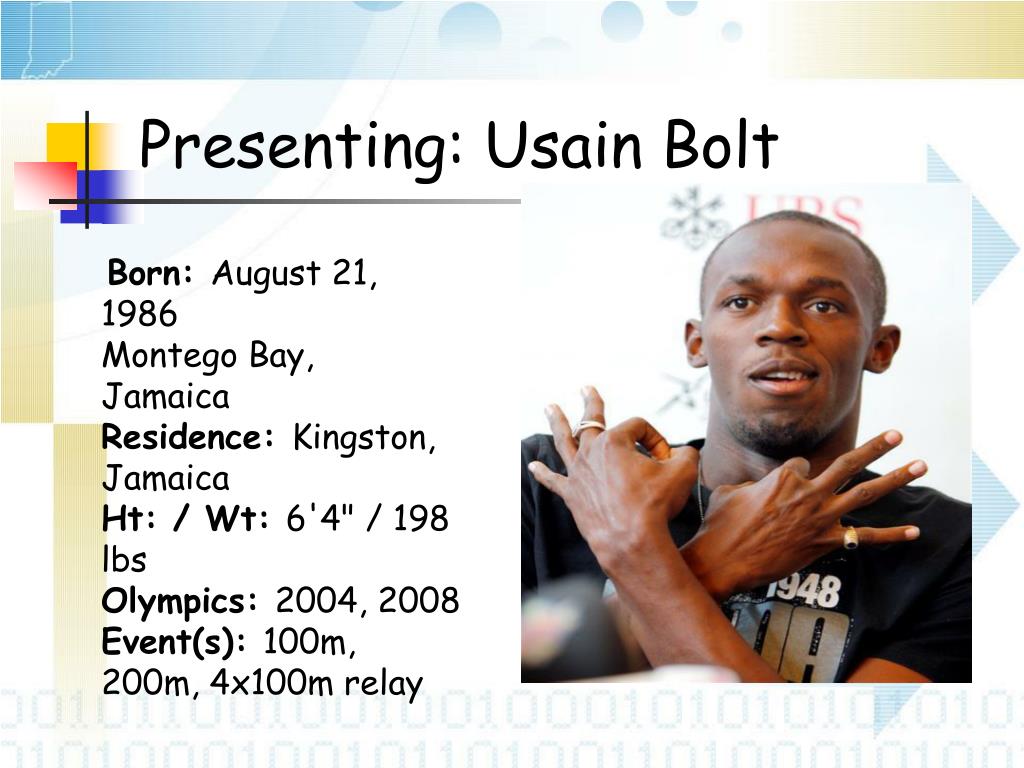 Presenting: Usain Bolt Born: August 21, 1986Montego Bay, Jamaica Residence: Kingston, JamaicaHt: / Wt: 6'4" / 198 lbs Olympics: 2004, 2008Event(s): 100m, 200m, 4x100m relay