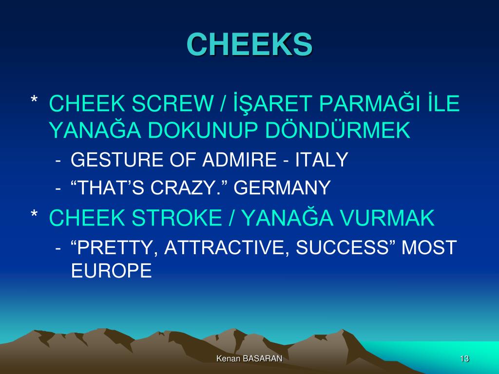 CHEEKS • CHEEK SCREW / İŞARET PARMAĞI İLE YANAĞA DOKUNUP DÖNDÜRMEK • GESTURE OF ADMIRE - ITALY • “THAT’S CRAZY.” GERMANY • CHEEK STROKE / YANAĞA VURMAK • “PRETTY, ATTRACTIVE, SUCCESS” MOST EUROPE Kenan BASARAN