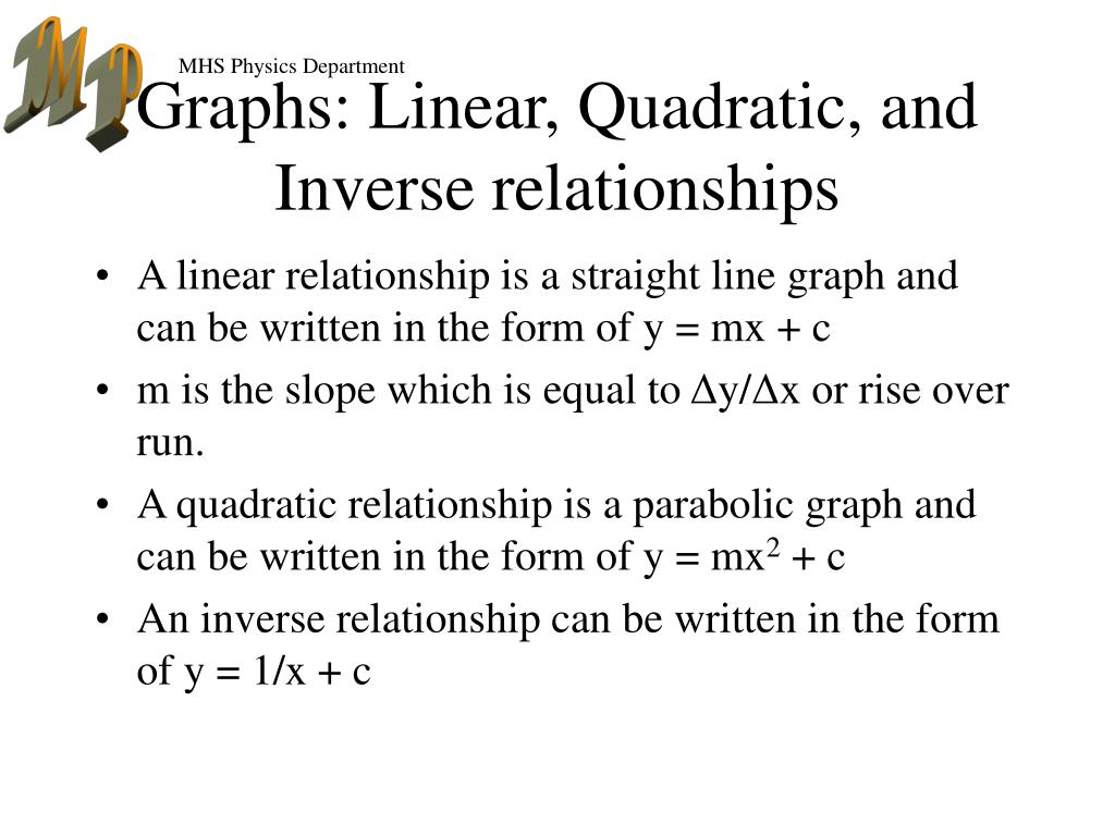 Graphs: Linear, Quadratic, and Inverse relationships • A linear relationship is a straight line graph and can be written in the form of y = mx + c • m is the slope which is equal to Δy/Δx or rise over run. • A quadratic relationship is a parabolic graph and can be written in the form of y = mx2 + c • An inverse relationship can be written in the form of y = 1/x + c