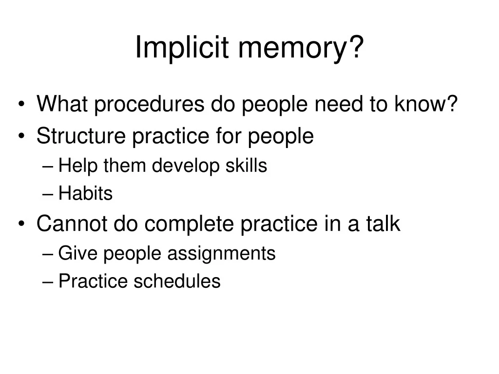 Implicit memory? • What procedures do people need to know? • Structure practice for people • Help them develop skills • Habits • Cannot do complete practice in a talk • Give people assignments • Practice schedules
