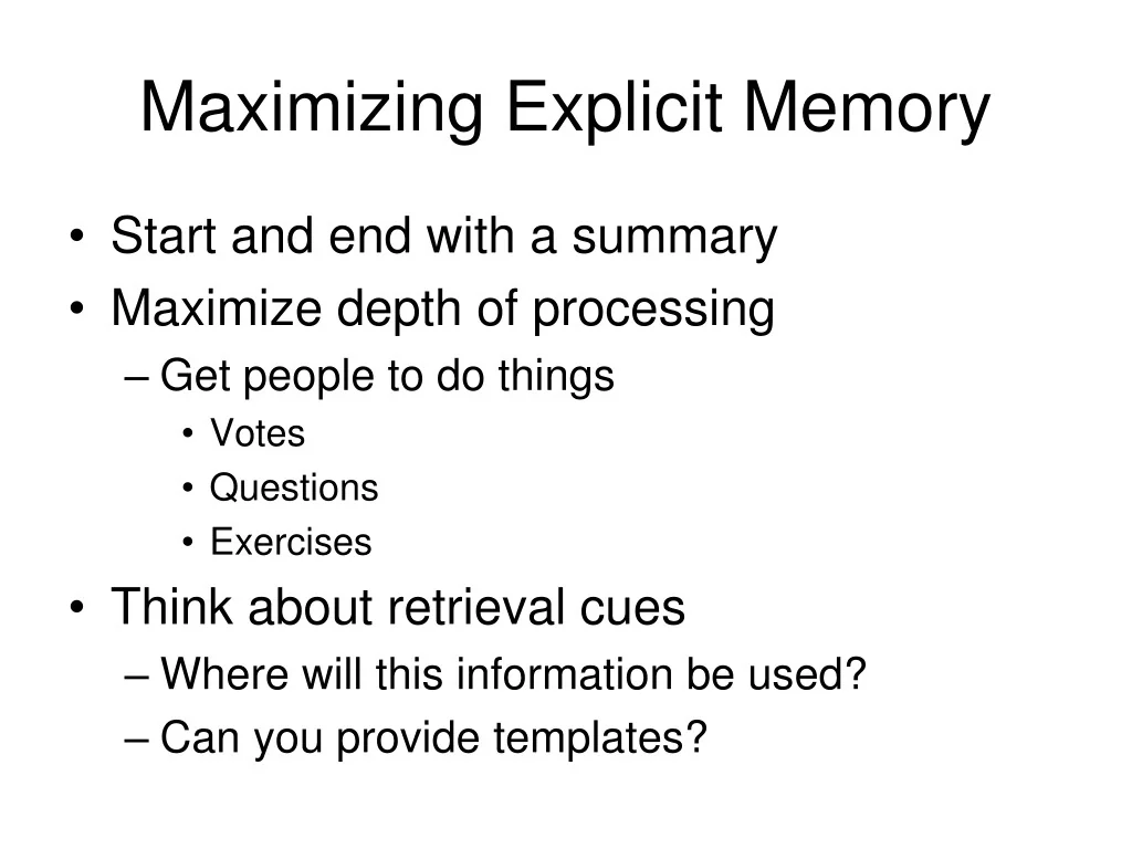 Maximizing Explicit Memory • Start and end with a summary • Maximize depth of processing • Get people to do things • Votes • Questions • Exercises • Think about retrieval cues • Where will this information be used? • Can you provide templates?