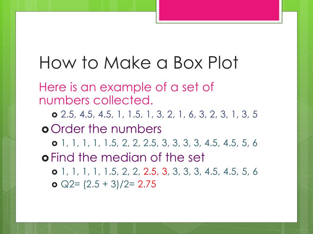 How to Make a Box Plot Here is an example of a set of numbers collected. • 2.5, 4.5, 4.5, 1, 1.5, 1, 3, 2, 1, 6, 3, 2, 3, 1, 3, 5 • Order the numbers • 1, 1, 1, 1, 1.5, 2, 2, 2.5, 3, 3, 3, 3, 4.5, 4.5, 5, 6 • Find the median of the set • 1, 1, 1, 1, 1.5, 2, 2, 2.5, 3, 3, 3, 3, 4.5, 4.5, 5, 6 • Q2= (2.5 + 3)/2= 2.75