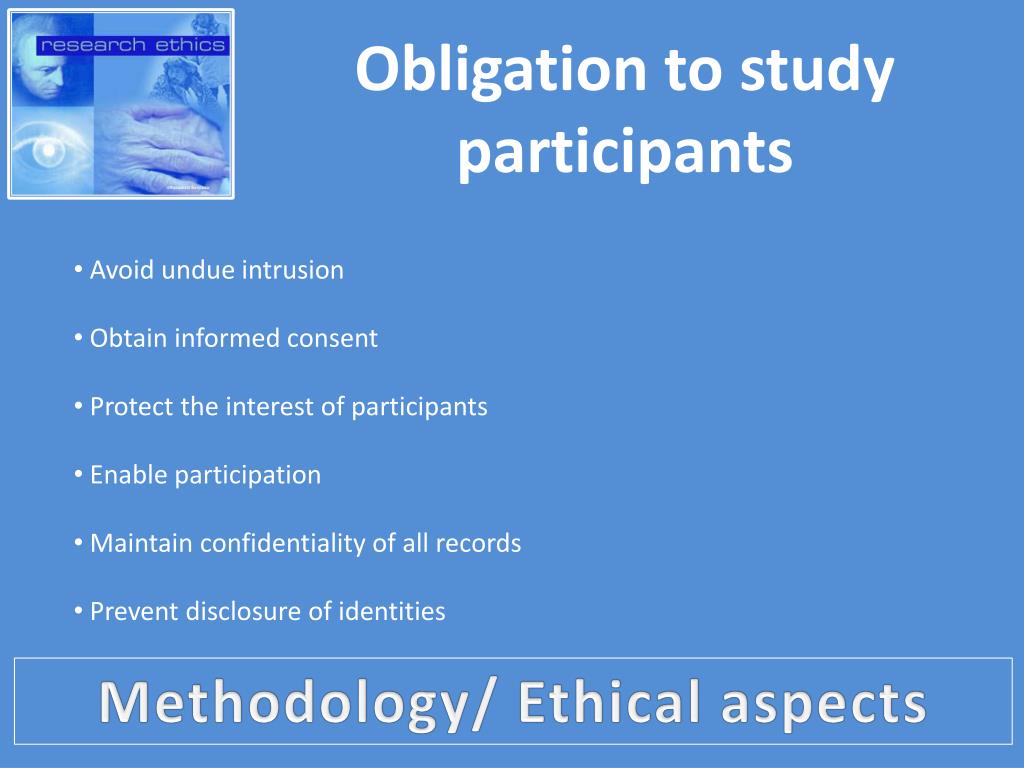 Obligation to study participants • Avoid undue intrusion • Obtain informed consent • Protect the interest of participants • Enable participation • Maintain confidentiality of all records • Prevent disclosure of identities Methodology/ Ethical aspects