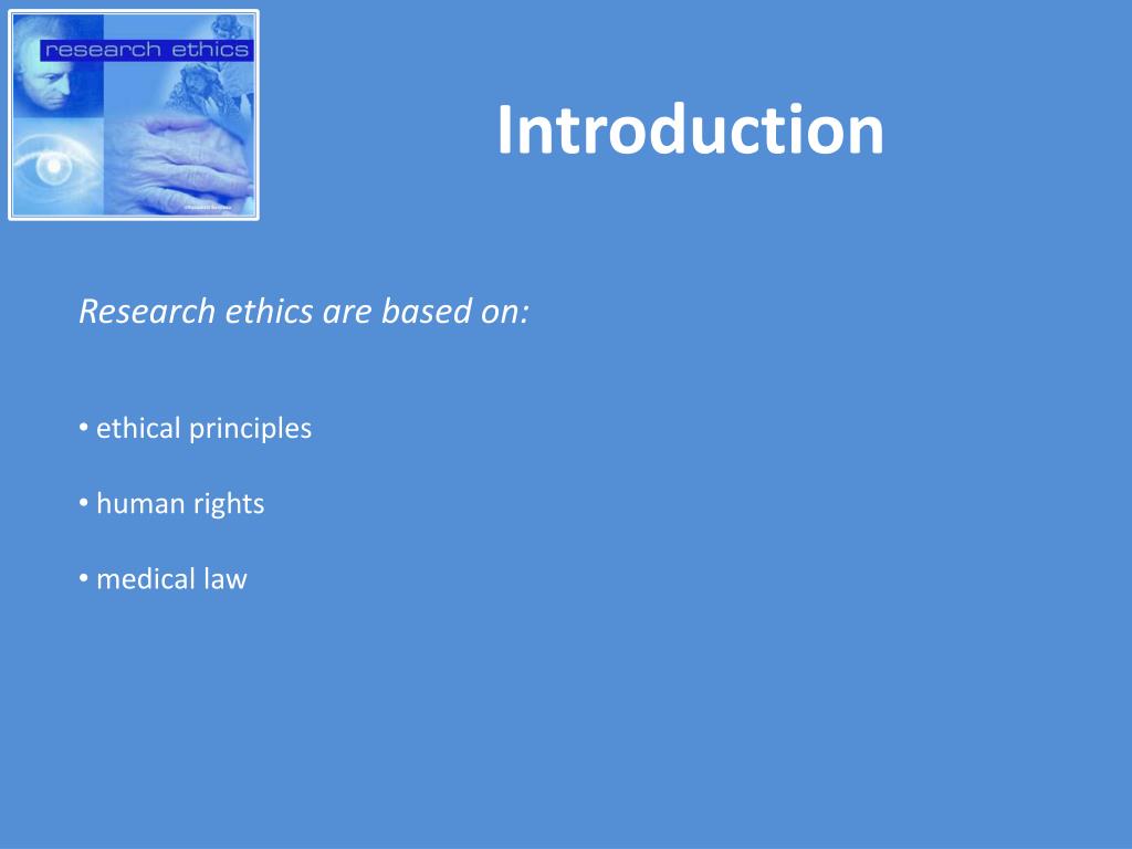 Introduction • Research ethics are based on: • ethical principles • human rights • medical law