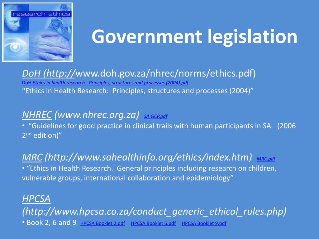 Government legislation • DoH (http://www.doh.gov.za/nhrec/norms/ethics.pdf) DoH Ethics in health research - Principles, structures and processes (2004).pdf • “Ethics in Health Research: Principles, structures and processes (2004)” • NHREC(www.nhrec.org.za) SA GCP.pdf • “Guidelines for good practice in clinical trails with human participants in SA (2006 2nd edition)” • MRC (http://www.sahealthinfo.org/ethics/index.htm) MRC.pdf • “Ethics in Health Research. General principles including research on children, vulnerable groups, international collaboration and epidemiology” • HPCSA (http://www.hpcsa.co.za/conduct_generic_ethical_rules.php) • Book 2, 6 and 9 HPCSA Booklet 2.pdfHPCSA Booklet 6.pdfHPCSA Booklet 9.pdf