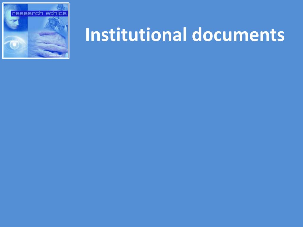 International documents • Declaration of HelsinkiDeclaration of Helsinki.pdf(http://www.history.nih.gov/research/downloads/helsinki.pdf) • Best known document related to medical ethics • Established in 1964 and revised 8 times (latest version 2008) • WMA Research manualWMA Research Ethics Manual.pdf(http://www.wma.net/en/30publications/30ethicsmanual/pdf/ethics_manual_en.pdf) • “WMA Medical Ethics Manual”