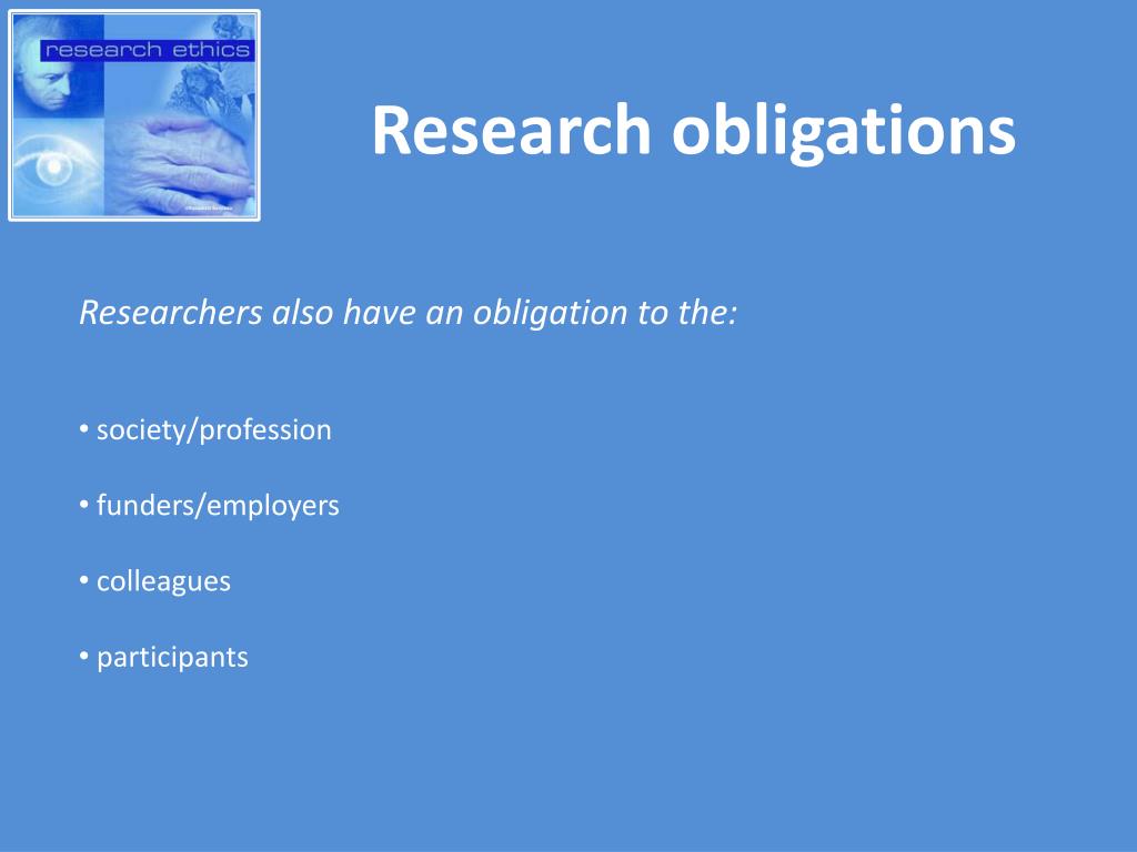 Research obligations • Researchers also have an obligation to the: • society/profession • funders/employers • colleagues • participants
