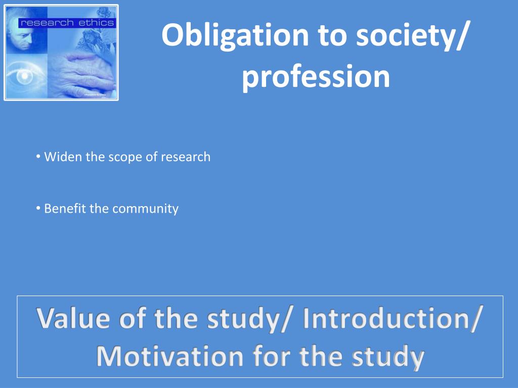 Obligation to society/ profession • Widen the scope of research • Benefit the community Value of the study/ Introduction/ Motivation for the study