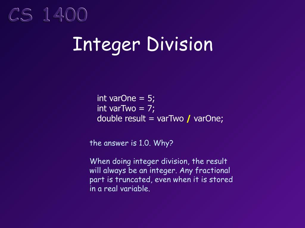 Integer Division intvarOne = 5; intvarTwo = 7; double result = varTwo/varOne; the answer is 1.0. Why? When doing integer division, the result will always be an integer. Any fractional part is truncated, even when it is stored in a real variable.