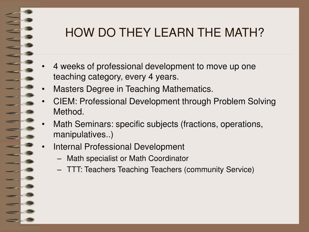 HOW DO THEY LEARN THE MATH? • 4 weeks of professional development to move up one teaching category, every 4 years. • Masters Degree in Teaching Mathematics. • CIEM: Professional Development through Problem Solving Method. • Math Seminars: specific subjects (fractions, operations, manipulatives..) • Internal Professional Development • Math specialist or Math Coordinator • TTT: Teachers Teaching Teachers (community Service)