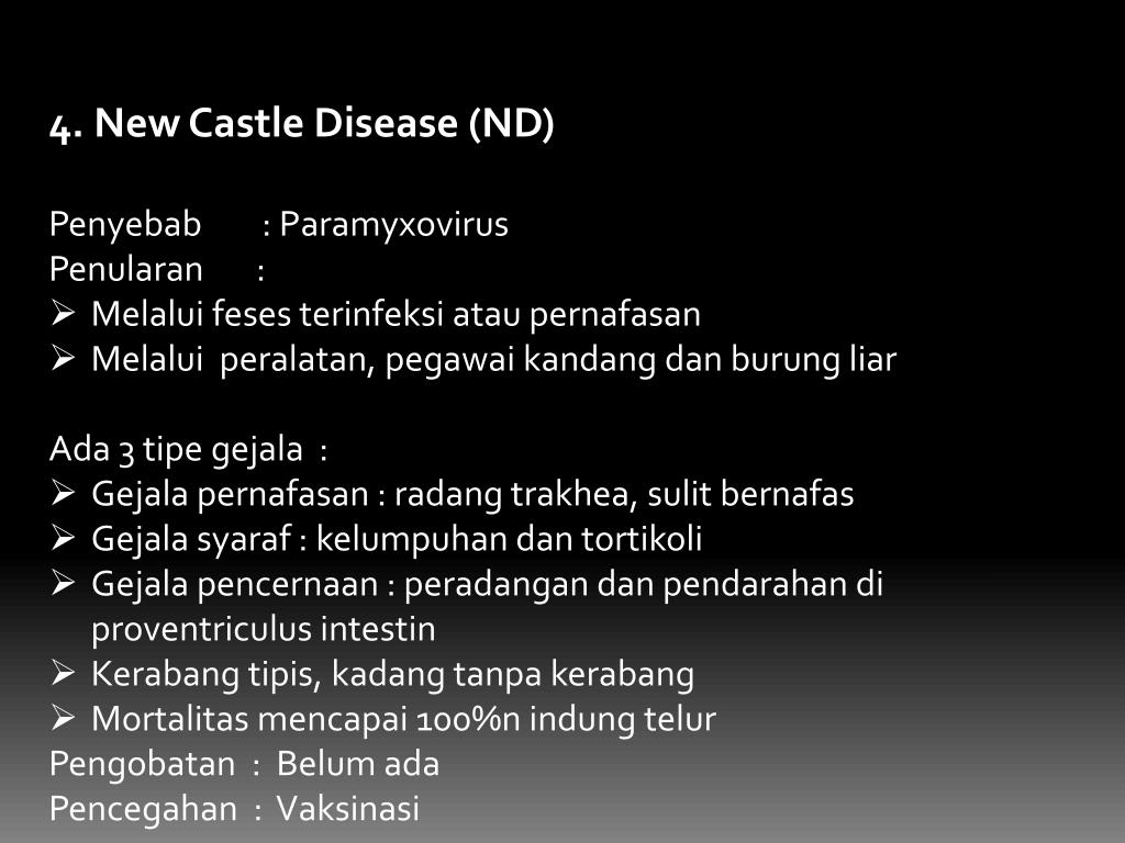 3. Avian Influenza (AI) • Penyebab : Myxovirus • Gejala : • Kematianmendadakdalamjumlahbanyak • Jenggerdanpialberwarnaungukebiruan (sianosis) • Kadang-kadangkeluarcairandarimatadanhidung • Mukadankepalamengalamipembengkakan • Terjadipendarahandibawahkulit • Terdapatbintik-bintikperdarahanpada dada, kaki dantelapak kaki • Otot dada berwarnaungukebiruan • Diarecair • Padaayampetelur, bedahbangkaimemperlihatkanbakaltelur yang menyerupaibuburdanberdarah • Penularan : • Melaluiudara / pernafasan • Melaluifeses • Peralatandanpegawaikandang • Pengobatan : • Belumada • Pemberianantibitikdapatmengurangiinfeksisekunder • Pencegahan : Vaksinansi