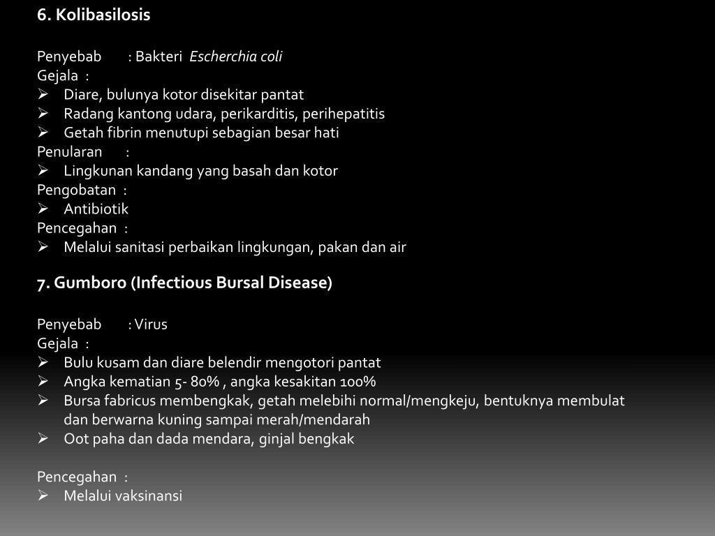 6. Kolibasilosis • Penyebab : BakteriEscherchia coli • Gejala : • Diare, bulunyakotordisekitarpantat • Radangkantongudara, perikarditis, perihepatitis • Getah fibrin menutupisebagianbesarhati • Penularan : • Lingkunankandang yang basahdankotor • Pengobatan : • Antibiotik • Pencegahan : • Melaluisanitasiperbaikanlingkungan, pakandan air • 7. Gumboro (Infectious Bursal Disease) • Penyebab : Virus • Gejala : • Bulukusamdandiarebelendirmengotoripantat • Angkakematian 5- 80% , angkakesakitan 100% • Bursa fabricusmembengkak, getahmelebihi normal/mengkeju, bentuknyamembulatdanberwarnakuningsampaimerah/mendarah • Ootpahadan dada mendara, ginjalbengkak • Pencegahan : • Melaluivaksinansi