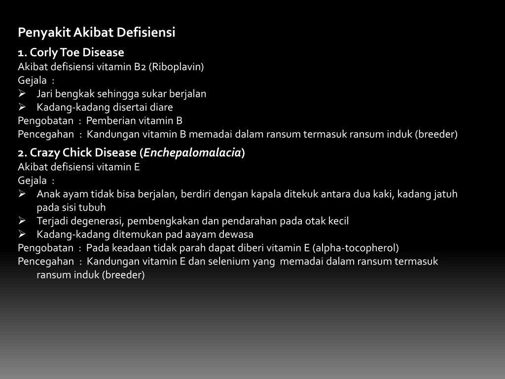 PenyakitAkibatDefisiensi • 1. Corly Toe Disease • Akibatdefisiensi vitamin B2 (Riboplavin) • Gejala : • Jaribengkaksehinggasukarberjalan • Kadang-kadangdisertaidiare • Pengobatan : Pemberian vitamin B • Pencegahan : Kandungan vitamin B memadaidalamransumtermasukransuminduk (breeder) • 2. Crazy Chick Disease (Enchepalomalacia) • Akibatdefisiensi vitamin E • Gejala : • Anakayamtidakbisaberjalan, berdiridengankapaladitekukantaradua kaki, kadangjatuhpadasisitubuh • Terjadidegenerasi, pembengkakandanpendarahanpadaotakkecil • Kadang-kadangditemukan pad aayamdewasa • Pengobatan : Padakeadaantidakparahdapatdiberi vitamin E (alpha-tocopherol) • Pencegahan : Kandungan vitamin E dan selenium yang memadaidalamransumtermasukransuminduk (breeder)