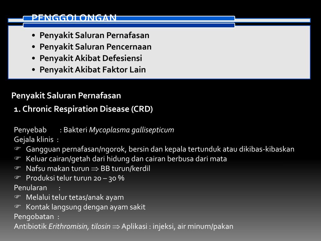 PenyakitSaluranPernafasan • 1. Chronic Respiration Disease (CRD) • Penyebab : BakteriMycoplasmagallisepticum • Gejalaklinis : • Gangguanpernafasan/ngorok, bersindankepalatertundukataudikibas-kibaskan • Keluarcairan/getahdarihidungdancairanberbusadarimata • Nafsumakanturun BB turun/kerdil • Produksitelurturun 20 – 30 % • Penularan : • Melaluitelurtetas/anakayam • Kontaklangsungdenganayamsakit • Pengobatan : • AntibiotikErithromisin, tilosin Aplikasi : injeksi, air minum/pakan