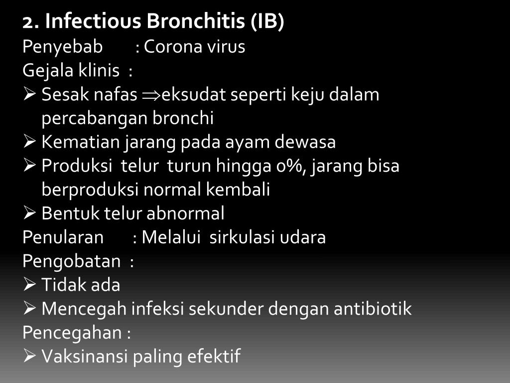 2. Infectious Bronchitis (IB) • Penyebab : Corona virus • Gejalaklinis : • Sesaknafaseksudatsepertikejudalampercabangan bronchi • Kematianjarangpadaayamdewasa • Produksitelurturunhingga 0%, jarangbisaberproduksi normal kembali • Bentuktelur abnormal • Penularan : Melaluisirkulasiudara • Pengobatan : • Tidakada • Mencegahinfeksisekunderdenganantibiotik • Pencegahan : • Vaksinansi paling efektif