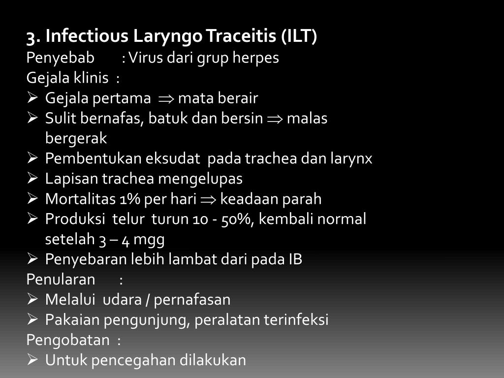 3. Infectious LaryngoTraceitis (ILT) • Penyebab : Virus darigrup herpes • Gejalaklinis : • Gejalapertama mataberair • Sulitbernafas, batukdanbersin malasbergerak • Pembentukaneksudatpada trachea dan larynx • Lapisan trachea mengelupas • Mortalitas 1% per hari keadaanparah • Produksitelurturun 10 - 50%, kembali normal setelah 3 – 4 mgg • Penyebaranlebihlambatdaripada IB • Penularan : • Melaluiudara / pernafasan • Pakaianpengunjung, peralatanterinfeksi • Pengobatan : • Untukpencegahandilakukan