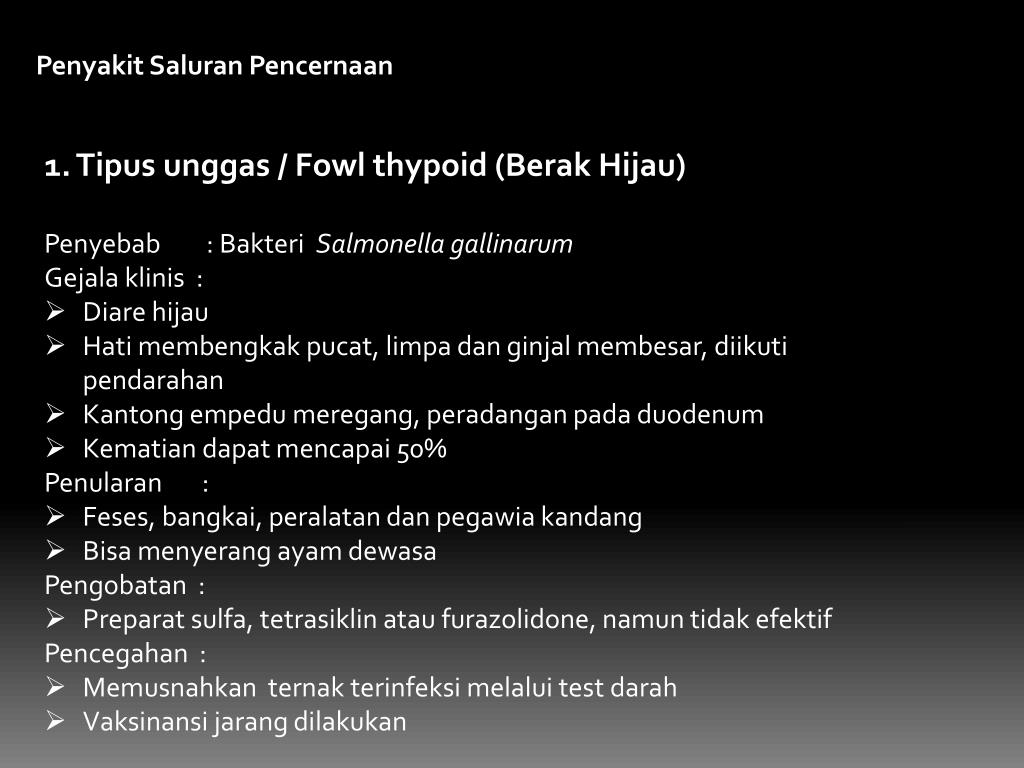 PenyakitSaluranPencernaan • 1. Tipusunggas / Fowl thypoid (BerakHijau) • Penyebab : BakteriSalmonella gallinarum • Gejalaklinis : • Diarehijau • Hatimembengkakpucat, limpadanginjalmembesar, diikutipendarahan • Kantongempedumeregang, peradanganpada duodenum • Kematiandapatmencapai 50% • Penularan : • Feses, bangkai, peralatandanpegawiakandang • Bisamenyerangayamdewasa • Pengobatan : • Preparat sulfa, tetrasiklinataufurazolidone, namuntidakefektif • Pencegahan : • Memusnahkanternakterinfeksimelalui test darah • Vaksinansijarangdilakukan