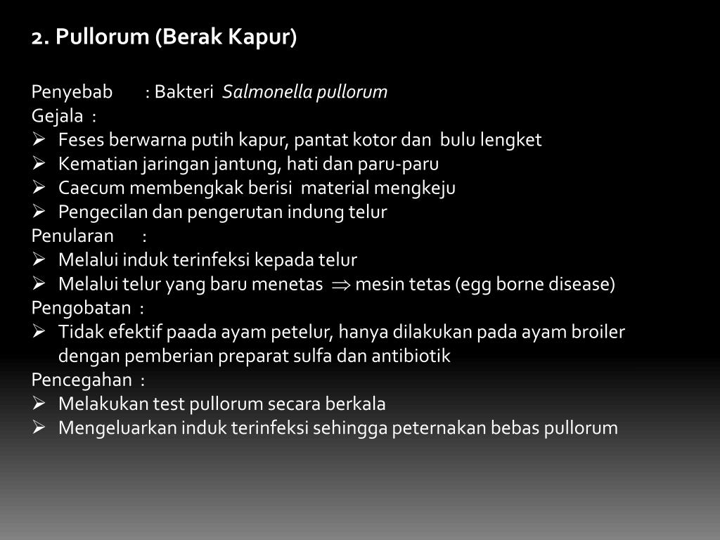 2. Pullorum (BerakKapur) • Penyebab : BakteriSalmonella pullorum • Gejala : • Fesesberwarnaputihkapur, pantatkotordanbululengket • Kematianjaringanjantung, hatidanparu-paru • Caecummembengkakberisi material mengkeju • Pengecilandanpengerutanindungtelur • Penularan : • Melaluiindukterinfeksikepadatelur • Melaluitelur yang barumenetas mesintetas (egg borne disease) • Pengobatan : • Tidakefektifpaadaayampetelur, hanyadilakukanpadaayam broiler denganpemberianpreparat sulfa danantibiotik • Pencegahan : • Melakukan test pullorumsecaraberkala • Mengeluarkanindukterinfeksisehinggapeternakanbebaspullorum