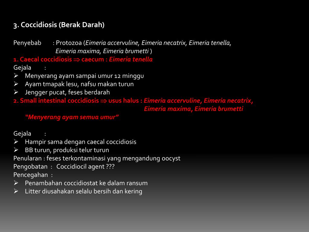 3. Coccidiosis (BerakDarah) • Penyebab : Protozoa (Eimeriaaccervuline, Eimerianecatrix, Eimeriatenella, • Eimeria maxima, Eimeriabrumetti) • 1. Caecalcoccidiosis caecum : Eimeriatenella • Gejala : • Menyerangayamsampaiumur 12 minggu • Ayamtmapaklesu, nafsumakanturun • Jenggerpucat, fesesberdarah • 2. Small intestinal coccidiosis usushalus : Eimeriaaccervuline, Eimerianecatrix, • Eimeria maxima, Eimeriabrumetti • “Menyerangayamsemuaumur” • Gejala : • Hampirsamadengancaecalcoccidiosis • BB turun, produksitelurturun • Penularan : fesesterkontaminasi yang mengandungoocyst • Pengobatan : Coccidiocil agent ??? • Pencegahan : • Penambahancoccidiostatkedalamransum • Litter diusahakanselalubersihdankering