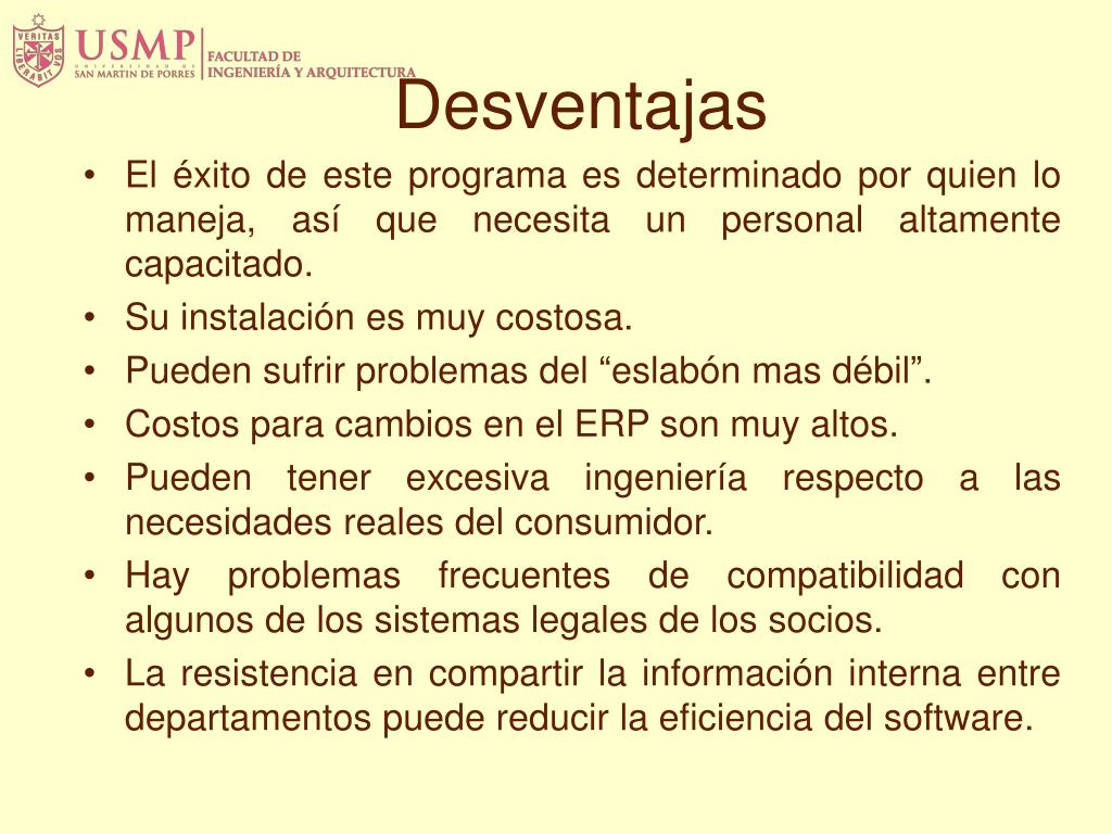 Desventajas El éxito de este programa es determinado por quien lo maneja, así que necesita un personal altamente capacitado. Su instalación es muy costosa. Pueden sufrir problemas del “eslabón mas débil”. Costos para cambios en el ERP son muy altos. Pueden tener excesiva ingeniería respecto a las necesidades reales del consumidor. Hay problemas frecuentes de compatibilidad con algunos de los sistemas legales de los socios. La resistencia en compartir la información interna entre departamentos puede reducir la eficiencia del software.