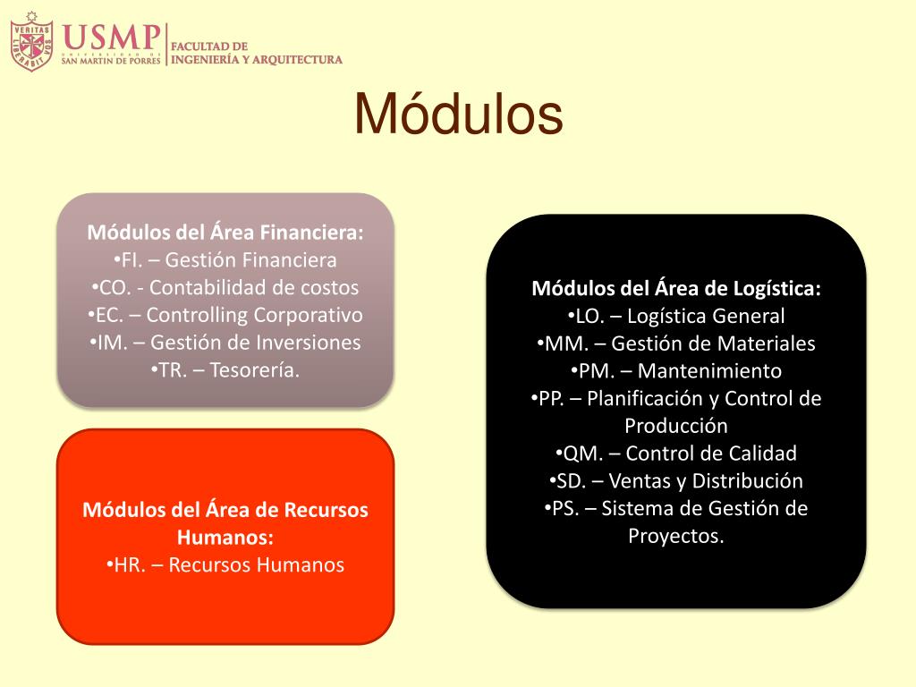 Módulos • Módulos del Área Financiera: • FI. – Gestión Financiera • CO. - Contabilidad de costos • EC. – Controlling Corporativo • IM. – Gestión de Inversiones • TR. – Tesorería. • Módulos del Área de Logística: • LO. – Logística General • MM. – Gestión de Materiales • PM. – Mantenimiento • PP. – Planificación y Control de Producción • QM. – Control de Calidad • SD. – Ventas y Distribución • PS. – Sistema de Gestión de Proyectos. • Módulos del Área de Recursos Humanos: • HR. – Recursos Humanos