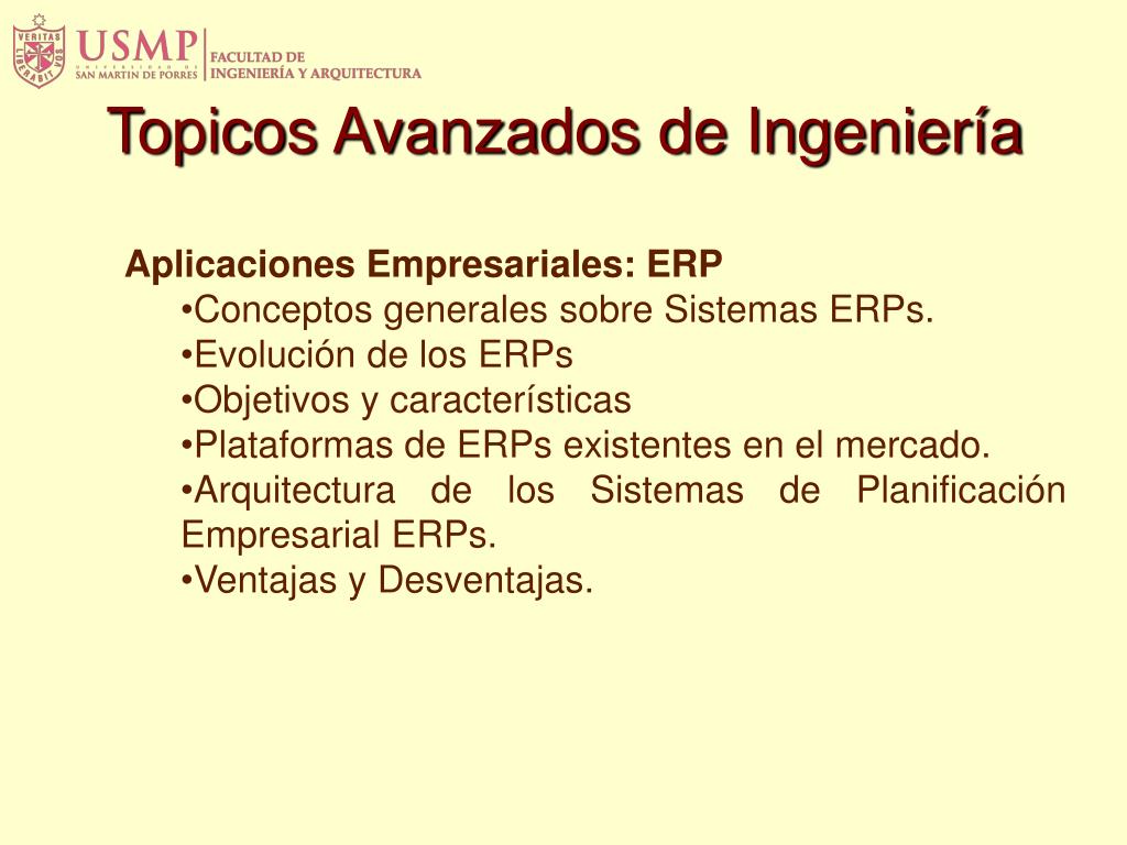 Topicos Avanzados de Ingeniería • Aplicaciones Empresariales: ERP • Conceptos generales sobre Sistemas ERPs. • Evolución de los ERPs • Objetivos y características • Plataformas de ERPs existentes en el mercado. • Arquitectura de los Sistemas de Planificación Empresarial ERPs. • Ventajas y Desventajas.