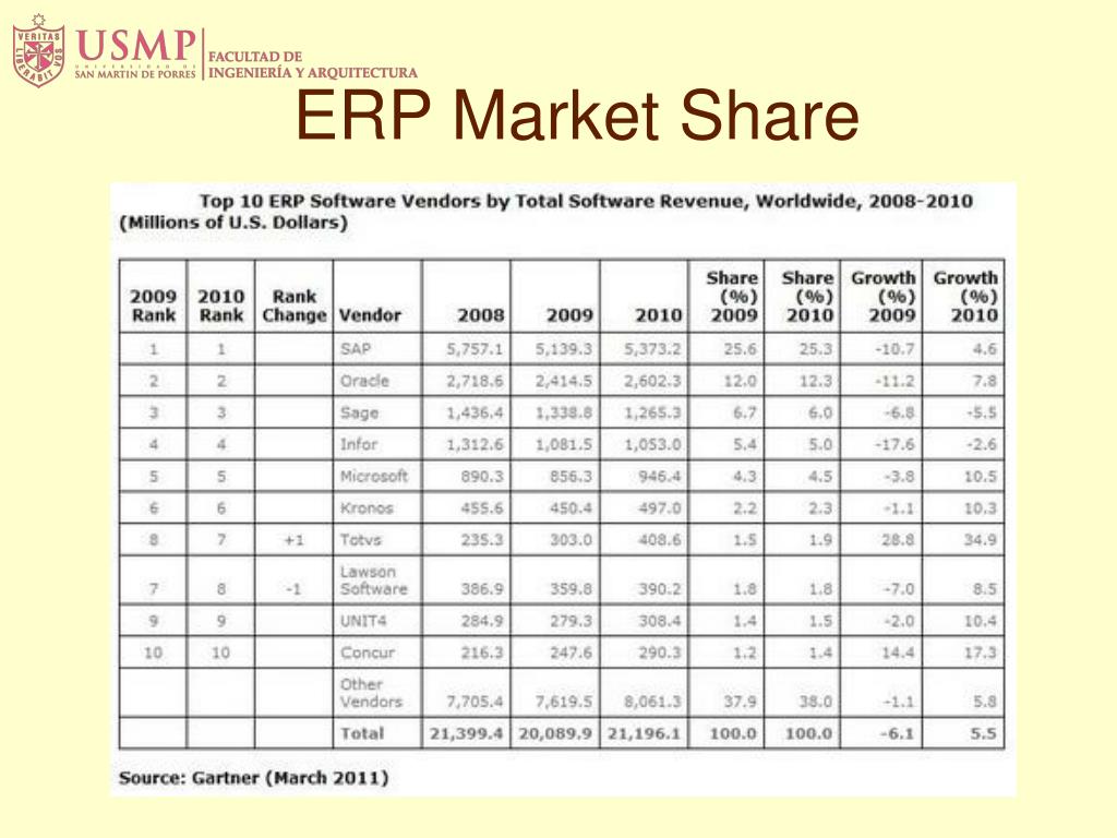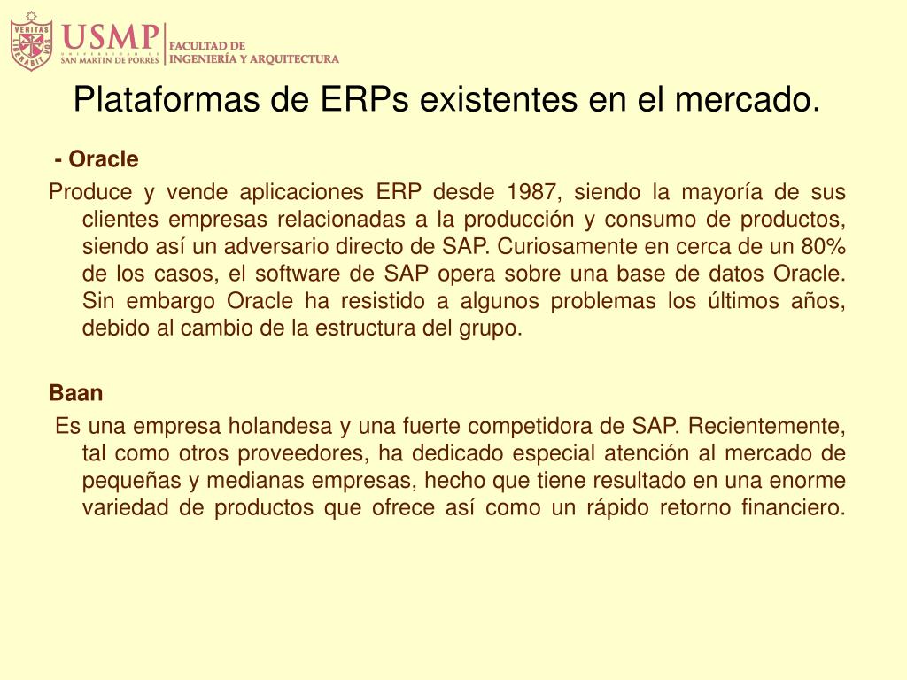 Plataformas de ERPs existentes en el mercado. - Oracle Produce y vende aplicaciones ERP desde 1987, siendo la mayoría de sus clientes empresas relacionadas a la producción y consumo de productos, siendo así un adversario directo de SAP. Curiosamente en cerca de un 80% de los casos, el software de SAP opera sobre una base de datos Oracle. Sin embargo Oracle ha resistido a algunos problemas los últimos años, debido al cambio de la estructura del grupo. Baan Es una empresa holandesa y una fuerte competidora de SAP. Recientemente, tal como otros proveedores, ha dedicado especial atención al mercado de pequeñas y medianas empresas, hecho que tiene resultado en una enorme variedad de productos que ofrece así como un rápido retorno financiero.