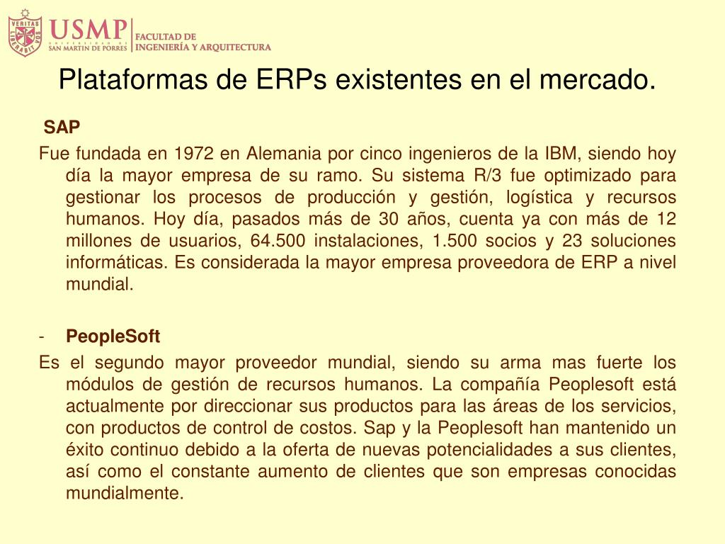 Plataformas de ERPs existentes en el mercado. SAP Fue fundada en 1972 en Alemania por cinco ingenieros de la IBM, siendo hoy día la mayor empresa de su ramo. Su sistema R/3 fue optimizado para gestionar los procesos de producción y gestión, logística y recursos humanos. Hoy día, pasados más de 30 años, cuenta ya con más de 12 millones de usuarios, 64.500 instalaciones, 1.500 socios y 23 soluciones informáticas. Es considerada la mayor empresa proveedora de ERP a nivel mundial. • PeopleSoft Es el segundo mayor proveedor mundial, siendo su arma mas fuerte los módulos de gestión de recursos humanos. La compañía Peoplesoft está actualmente por direccionar sus productos para las áreas de los servicios, con productos de control de costos. Sap y la Peoplesoft han mantenido un éxito continuo debido a la oferta de nuevas potencialidades a sus clientes, así como el constante aumento de clientes que son empresas conocidas mundialmente.