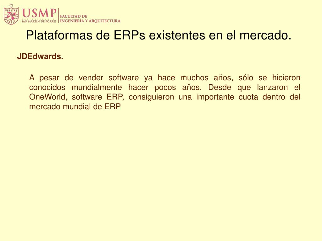 Plataformas de ERPs existentes en el mercado. JDEdwards. A pesar de vender software ya hace muchos años, sólo se hicieron conocidos mundialmente hacer pocos años. Desde que lanzaron el OneWorld, software ERP, consiguieron una importante cuota dentro del mercado mundial de ERP