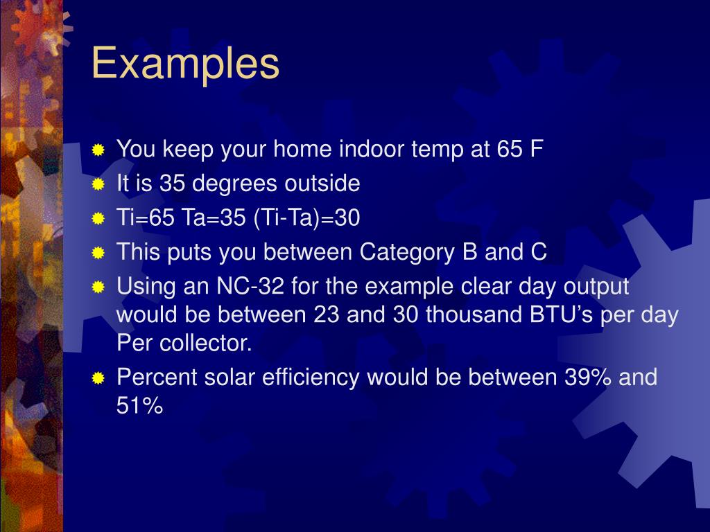 Examples You keep your home indoor temp at 65 F It is 35 degrees outside Ti=65 Ta=35 (Ti-Ta)=30 This puts you between Category B and C Using an NC-32 for the example clear day output would be between 23 and 30 thousand BTU’s per day Per collector. Percent solar efficiency would be between 39% and 51%