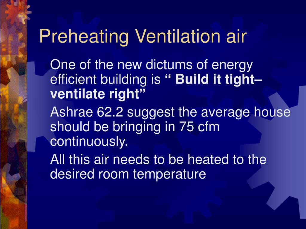 Preheating Ventilation air One of the new dictums of energy efficient building is “ Build it tight–ventilate right” Ashrae 62.2 suggest the average house should be bringing in 75 cfm continuously. All this air needs to be heated to the desired room temperature