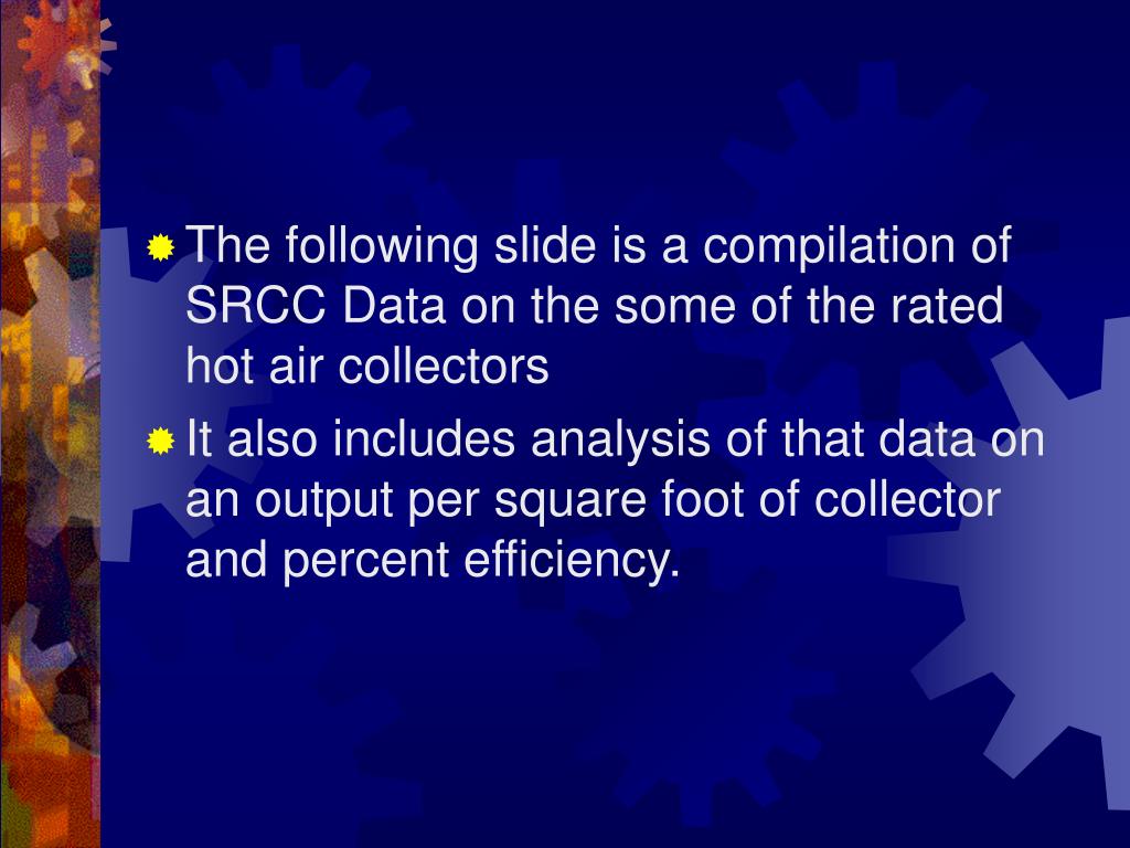 The following slide is a compilation of SRCC Data on the some of the rated hot air collectors • It also includes analysis of that data on an output per square foot of collector and percent efficiency.