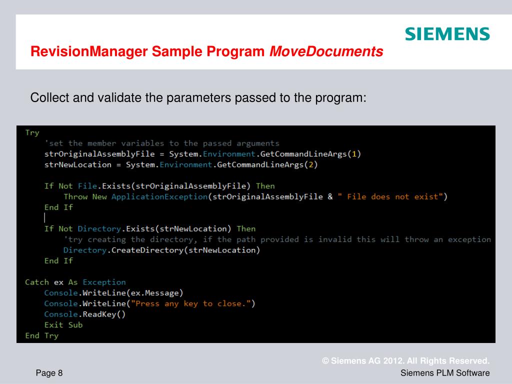 RevisionManager Sample Program MoveDocuments • Collect and validate the parameters passed to the program: