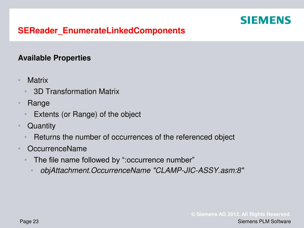 SEReader_EnumerateLinkedComponents • Available Properties • Matrix • 3D Transformation Matrix • Range • Extents (or Range) of the object • Quantity • Returns the number of occurrences of the referenced object • OccurrenceName • The file name followed by “:occurrence number” • objAttachment.OccurrenceName "CLAMP-JIC-ASSY.asm:8"