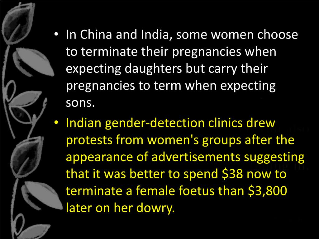 In China and India, some women choose to terminate their pregnancies when expecting daughters but carry their pregnancies to term when expecting sons. • Indian gender-detection clinics drew protests from women's groups after the appearance of advertisements suggesting that it was better to spend $38 now to terminate a female foetus than $3,800 later on her dowry.