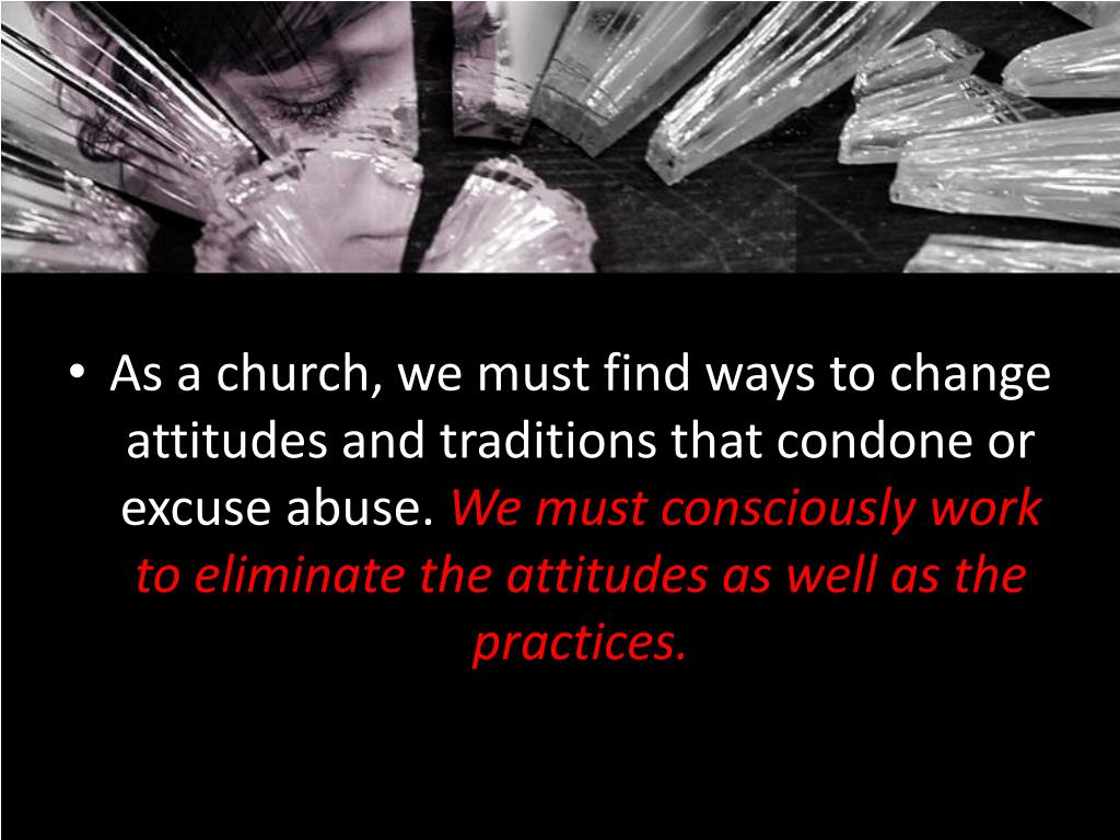 As a church, we must find ways to change attitudes and traditions that condone or excuse abuse. We must consciously work to eliminate the attitudes as well as the practices.