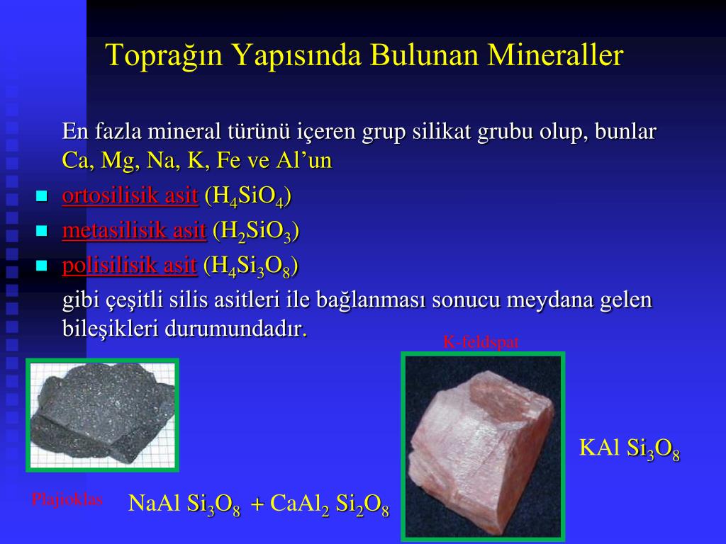 Toprağın Yapısında Bulunan Mineraller • En fazla mineral türünü içeren grup silikat grubu olup, bunlar Ca, Mg, Na, K, Fe ve Al’un • ortosilisik asit(H4SiO4) • metasilisik asit(H2SiO3) • polisilisik asit (H4Si3O8) • gibi çeşitli silis asitleri ile bağlanması sonucu meydana gelen bileşikleri durumundadır. K-feldspat KAlSi3O8 Plajioklas NaAlSi3O8 + CaAl2Si2O8