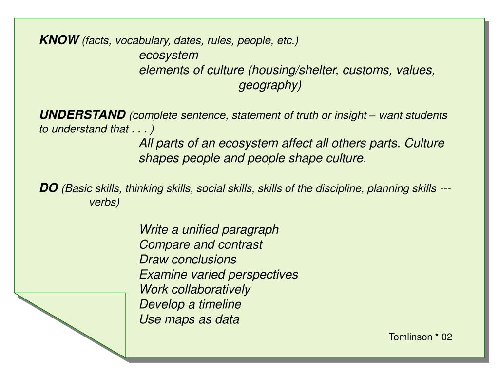 KNOW(facts, vocabulary, dates, rules, people, etc.) ecosystem elements of culture (housing/shelter, customs, values, geography) UNDERSTAND (complete sentence, statement of truth or insight – want students to understand that . . . ) All parts of an ecosystem affect all others parts. Culture shapes people and people shape culture. DO (Basic skills, thinking skills, social skills, skills of the discipline, planning skills --- verbs) Write a unified paragraph Compare and contrast Draw conclusions Examine varied perspectives Work collaboratively Develop a timeline Use maps as data Tomlinson * 02