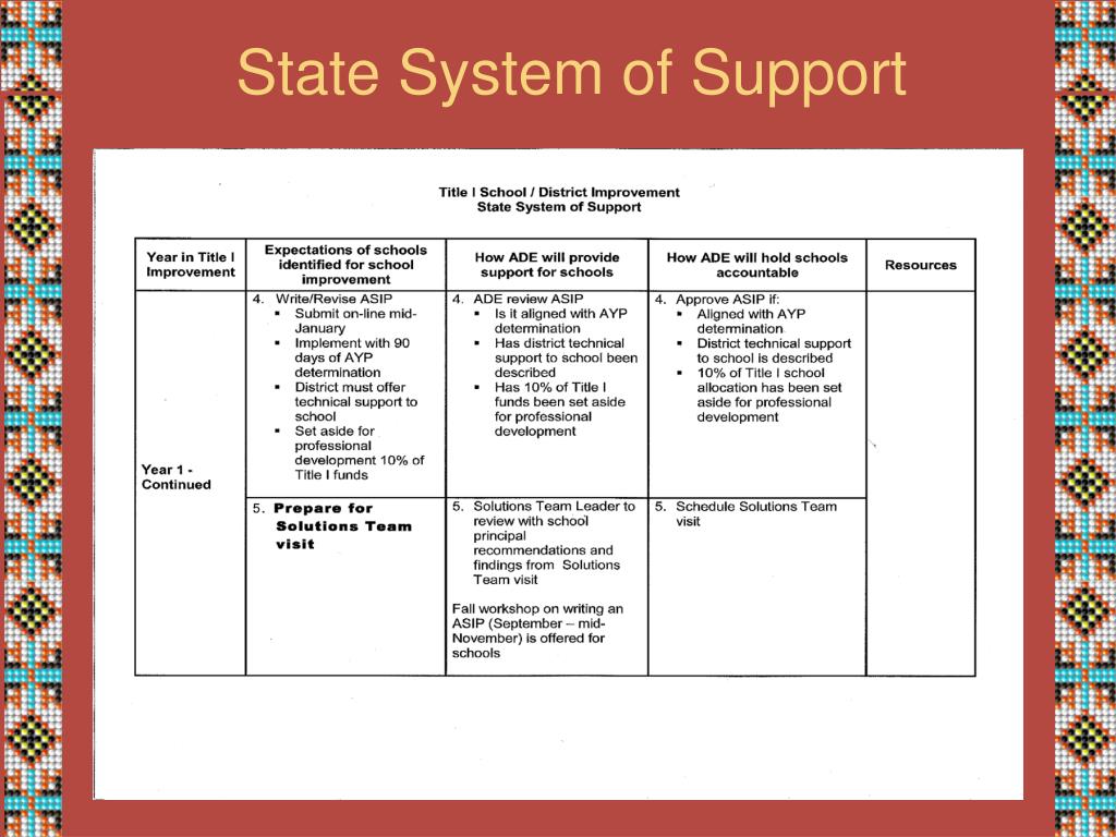 State System of SupportASSIST Coach • Monthly follow-up support is provided to each school by an ASSIST Coach. This person serves as a resource to the school leadership team, • Assisting in the coordination of all educational resources, specifically those available through the Arizona Department of Education; • Assisting the school in developing capacity for sustained school improvement; • Documenting school progress in implementing improvement plans that increase academic achievement for all students.