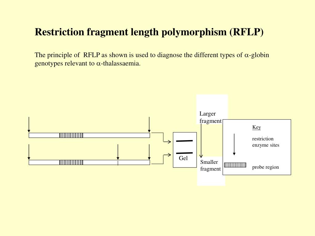Larger fragment Gel Smaller fragment Key restriction enzyme sites probe region Restriction fragment length polymorphism (RFLP) The principle of RFLP as shown is used to diagnose the different types of -globin genotypes relevant to -thalassaemia.