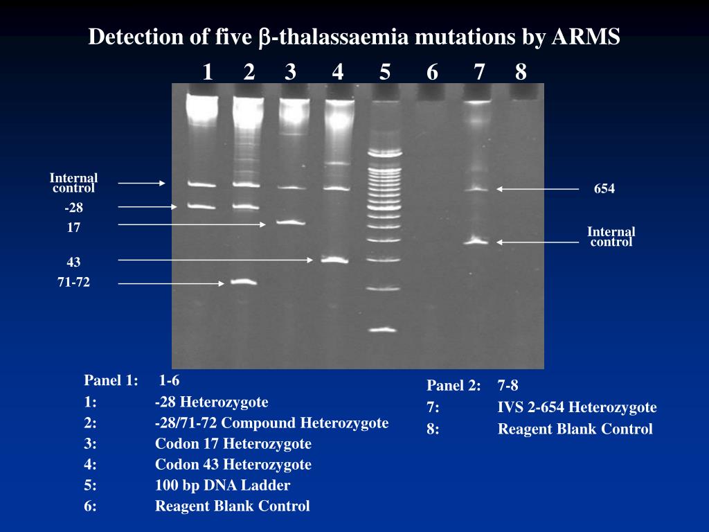 Detection of five -thalassaemia mutations by ARMS 1 2 3 4 5 6 7 8 Internal control -28 17 43 71-72 654 Internal control Panel 1: 1-6 1: -28 Heterozygote 2: -28/71-72 Compound Heterozygote 3: Codon 17 Heterozygote 4: Codon 43 Heterozygote 5: 100 bp DNA Ladder 6: Reagent Blank Control Panel 2: 7-8 7: IVS 2-654 Heterozygote 8: Reagent BlankControl
