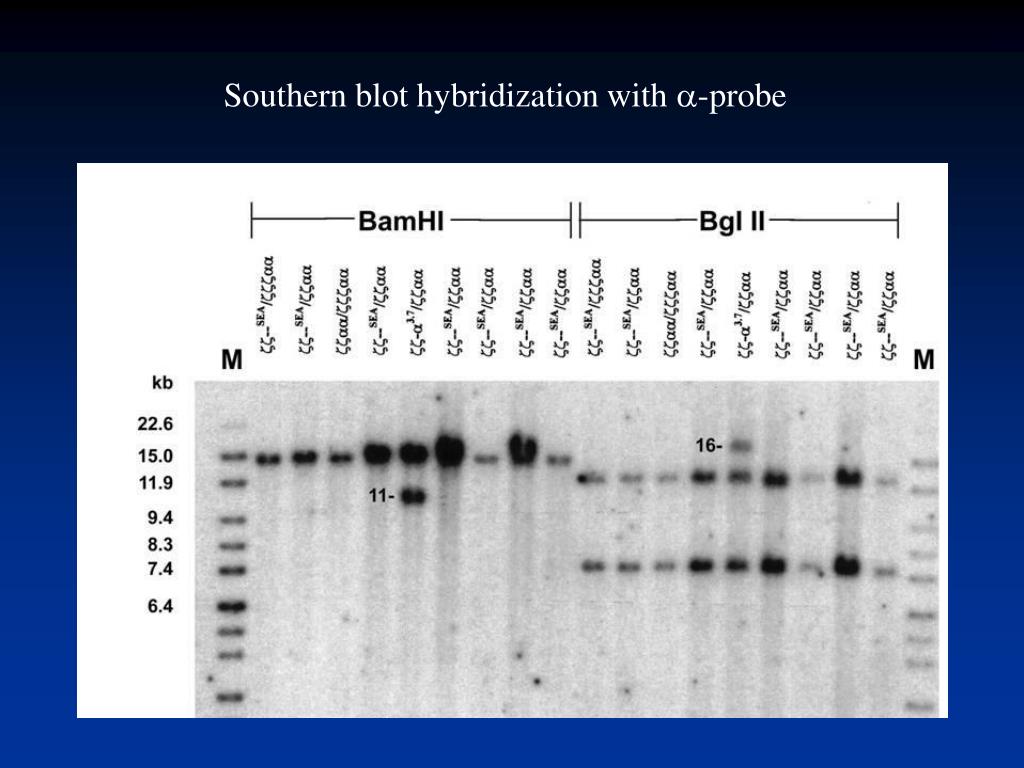 Single a-globin gene deletion and triplicated a-globin gene • Prevalence • 6% for –a3.7 and –a4.2 • Hb 13.6 ± 0.12 g/dL (11.8 – 15.6) • MCV 83.0 ± 0.33 fL (77.9 – 88.1) • MCH 27.2 ± 0.16 pg (24.1 – 29.7) • 1.5% for aaaanti-3.7 and aaaanti-4.2 • Hb 13.5 g/dL, MCV 85.5 fL, MCH 28.7 pg
