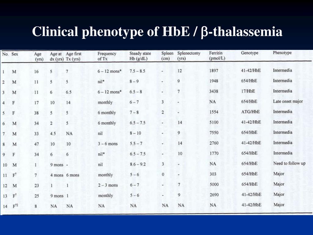 b-thalassaemia phenotypes b-thalassaemia major • Onset < 1 year • Transfusion dependent • Many complications • Markedly HcMc RBC • Nucleated reds • Majority HbF • Genotypes: homozygous or compound heterozygous for b-thalassaemia alleles