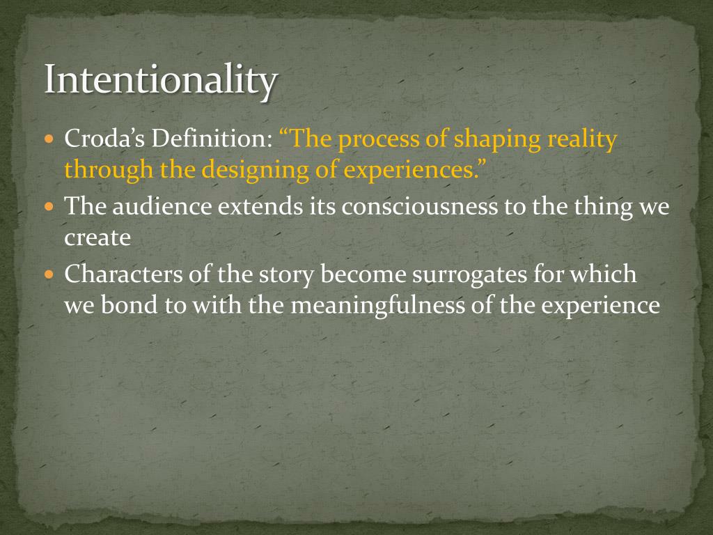 Intentionality • Croda’s Definition: “The process of shaping reality through the designing of experiences.” • The audience extends its consciousness to the thing we create • Characters of the story become surrogates for which we bond to with the meaningfulness of the experience
