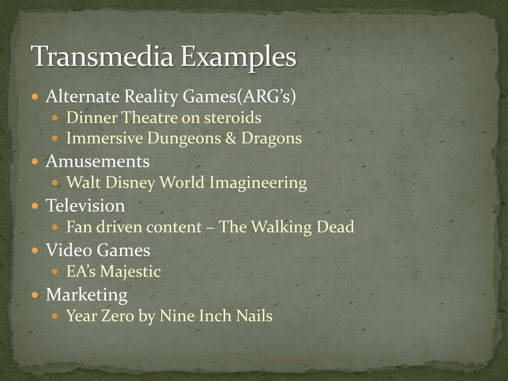 Transmedia Examples • Alternate Reality Games(ARG’s) • Dinner Theatre on steroids • Immersive Dungeons & Dragons • Amusements • Walt Disney World Imagineering • Television • Fan driven content – The Walking Dead • Video Games • EA’s Majestic • Marketing • Year Zero by Nine Inch Nails