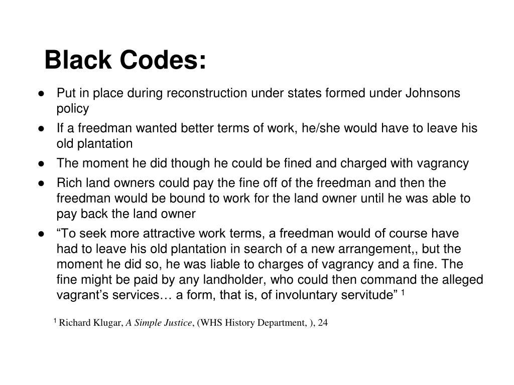 Black Codes: • Put in place during reconstruction under states formed under Johnsons policy • If a freedman wanted better terms of work, he/she would have to leave his old plantation • The moment he did though he could be fined and charged with vagrancy • Rich land owners could pay the fine off of the freedman and then the freedman would be bound to work for the land owner until he was able to pay back the land owner • “To seek more attractive work terms, a freedman would of course have had to leave his old plantation in search of a new arrangement,, but the moment he did so, he was liable to charges of vagrancy and a fine. The fine might be paid by any landholder, who could then command the alleged vagrant’s services… a form, that is, of involuntary servitude” 1 1 Richard Klugar, A Simple Justice, (WHS History Department, ), 24