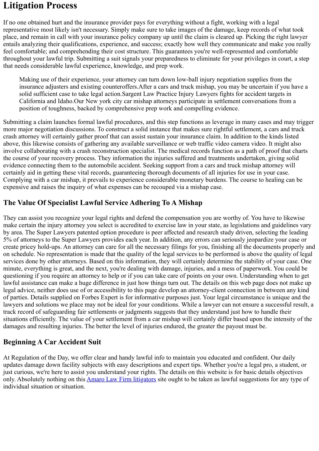 Litigation Process If no one obtained hurt and the insurance provider pays for everything without a fight, working with a legal representative most likely isn't necessary. Simply make sure to take images of the damage, keep records of what took place, and remain in call with your insurance policy company up until the claim is cleared up. Picking the right lawyer entails analyzing their qualifications, experience, and success; exactly how well they communicate and make you really feel comfortable; and comprehending their cost structure. This guarantees you're well-represented and comfortable throughout your lawful trip. Submitting a suit signals your preparedness to eliminate for your privileges in court, a step that needs considerable lawful experience, knowledge, and prep work. Making use of their experience, your attorney can turn down low-ball injury negotiation supplies from the insurance adjusters and existing counteroffers.After a cars and truck mishap, you may be uncertain if you have a solid sufficient case to take legal action.Sargent Law Practice Injury Lawyers fights for accident targets in California and Idaho.Our New york city car mishap attorneys participate in settlement conversations from a position of toughness, backed by comprehensive prep work and compelling evidence. Submitting a claim launches formal lawful procedures, and this step functions as leverage in many cases and may trigger more major negotiation discussions. To construct a solid instance that makes sure rightful settlement, a cars and truck crash attorney will certainly gather proof that can assist sustain your insurance claim. In addition to the kinds listed above, this likewise consists of gathering any available surveillance or web traffic video camera video. It might also involve collaborating with a crash reconstruction specialist. The medical records function as a path of proof that charts the course of your recovery process. They information the injuries suffered and treatments undertaken, giving solid evidence connecting them to the automobile accident. Seeking support from a cars and truck mishap attorney will certainly aid in getting these vital records, guaranteeing thorough documents of all injuries for use in your case. Complying with a car mishap, it prevails to experience considerable monetary burdens. The course to healing can be expensive and raises the inquiry of what expenses can be recouped via a mishap case. The Value Of Specialist Lawful Service Adhering To A Mishap They can assist you recognize your legal rights and defend the compensation you are worthy of. You have to likewise make certain the injury attorney you select is accredited to exercise law in your state, as legislations and guidelines vary by area. The Super Lawyers patented option procedure is peer affected and research study driven, selecting the leading 5% of attorneys to the Super Lawyers provides each year. In addition, any errors can seriously jeopardize your case or create pricey hold-ups. An attorney can care for all the necessary filings for you, finishing all the documents properly and on schedule. No representation is made that the quality of the legal services to be performed is above the quality of legal services done by other attorneys. Based on this information, they will certainly determine the stability of your case. One minute, everything is great, and the next, you're dealing with damage, injuries, and a mess of paperwork. You could be questioning if you require an attorney to help or if you can take care of points on your own. Understanding when to get lawful assistance can make a huge difference in just how things turn out. The details on this web page does not make up legal advice, neither does use of or accessibility to this page develop an attorney-client connection in between any kind of parties. Details supplied on Forbes Expert is for informative purposes just. Your legal circumstance is unique and the lawyers and solutions we place may not be ideal for your conditions. While a lawyer can not ensure a successful result, a track record of safeguarding fair settlements or judgments suggests that they understand just how to handle their situations efficiently. The value of your settlement from a car mishap will certainly differ based upon the intensity of the damages and resulting injuries. The better the level of injuries endured, the greater the payout must be. Beginning A Car Accident Suit At Regulation of the Day, we offer clear and handy lawful info to maintain you educated and confident. Our daily updates damage down facility subjects with easy descriptions and expert tips. Whether you're a legal pro, a student, or just curious, we're here to assist you understand your rights. The details on this website is for basic details objectives only. Absolutely nothing on this Amaro Law Firm litigators site ought to be taken as lawful suggestions for any type of individual situation or situation.