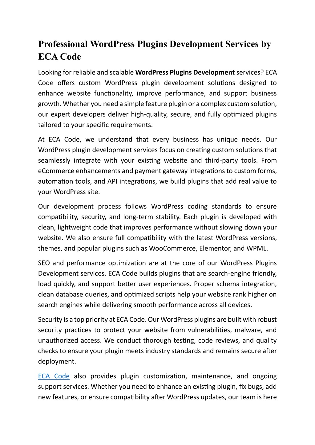 Professional WordPress Plugins Development Services by ECA Code Looking for reliable and scalable WordPress Plugins Development services? ECA Code offers custom WordPress plugin development solutions designed to enhance website functionality, improve performance, and support business growth. Whether you need a simple feature plugin or a complex custom solution, our expert developers deliver high-quality, secure, and fully optimized plugins tailored to your specific requirements. At ECA Code, we understand that every business has unique needs. Our WordPress plugin development services focus on creating custom solutions that seamlessly integrate with your existing website and third-party tools. From eCommerce enhancements and payment gateway integrations to custom forms, automation tools, and API integrations, we build plugins that add real value to your WordPress site. Our development process follows WordPress coding standards to ensure compatibility, security, and long-term stability. Each plugin is developed with clean, lightweight code that improves performance without slowing down your website. We also ensure full compatibility with the latest WordPress versions, themes, and popular plugins such as WooCommerce, Elementor, and WPML. SEO and performance optimization are at the core of our WordPress Plugins Development services. ECA Code builds plugins that are search-engine friendly, load quickly, and support better user experiences. Proper schema integration, clean database queries, and optimized scripts help your website rank higher on search engines while delivering smooth performance across all devices. Security is a top priority at ECA Code. Our WordPress plugins are built with robust security practices to protect your website from vulnerabilities, malware, and unauthorized access. We conduct thorough testing, code reviews, and quality checks to ensure your plugin meets industry standards and remains secure after deployment. ECA Code also provides plugin customization, maintenance, and ongoing support services. Whether you need to enhance an existing plugin, fix bugs, add new features, or ensure compatibility after WordPress updates, our team is here