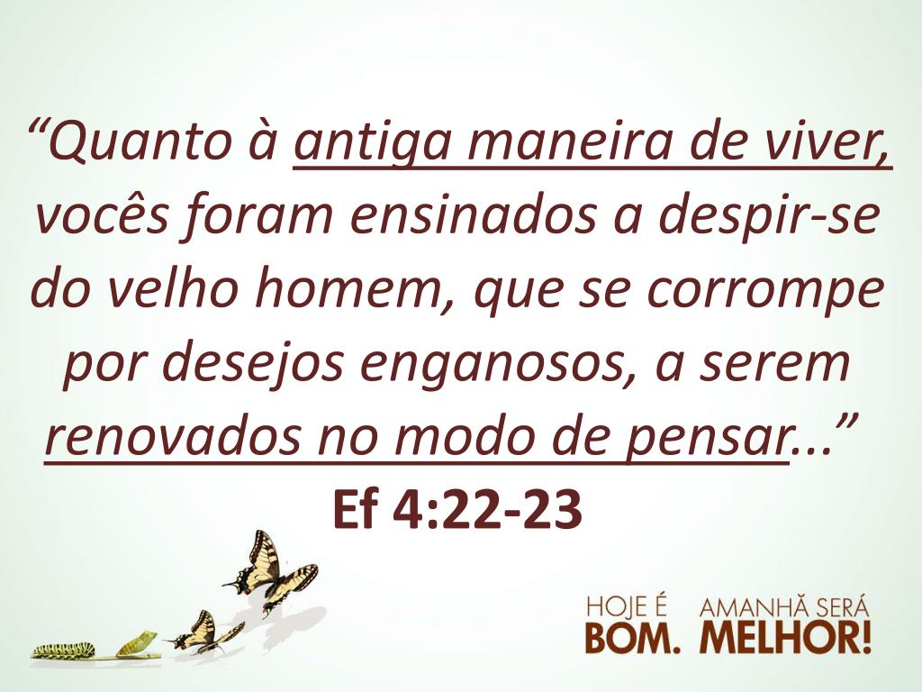“Quanto à antiga maneira de viver, vocês foram ensinados a despir-se do velho homem, que se corrompe por desejos enganosos, a serem renovados no modo de pensar...” Ef4:22-23